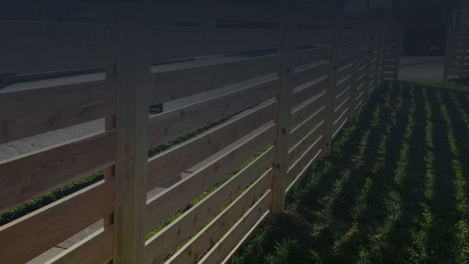 Newly built wooden privacy fences with a Jensen Fencing sign in front.
